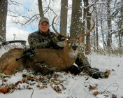 I immediately knew I hit the buck – archers know the distinct sound a penetrating arrow makes. I made a few phone calls and assessed the situation. Upon climbing down from my stand I found good blood. I was encouraged. I gave the deer 45 minutes and began to slowly track him through the snow. I went about 60 yards and looked up. To my amazement the deer laid 15 yards in front of me. He had his head up, but his breathing was obviously labored. I knocked another arrow and came to full draw. I let a second arrow fly – this one catching the front part of his lungs. The buck jumped up and ran up a small nearby hill. I called my Dad and told him I was not sure we’d recover the deer. I walked out and met my Dad where we gave the deer another 30 minutes to expire.