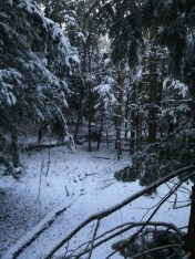 The buck was traveling in a northerly direction moving from my right to left directly behind the stand. To complicate things some, the overnight snow was weighing down the hemlock limbs in the area – much like heavy Christmas ornaments hang from the family tree. I struggled to see the buck as he continued his hobbled walk.